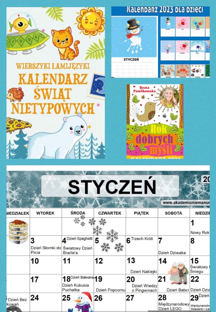 Kalendarze bywają piękne, artystyczne, zwykłe z cyferkami, albo z bardzo  wymyślnymi obrazkami. Można znaleźć dziesiątki informacji dodatkowych z rożnych sfer życia, różnych kategorii. Czego to ludzie nie wymyślą, by się dobrze sprzedało. No i dobrze! Kalendarze to także ozdoba naszych ścian, biurek, zbyt pustych miejsc w domu. Mimo wielkiej popularności internetowych kalendarzy, w tym Google’a na pierwszym miejscu, wciąż lubimy te tradycyjne.