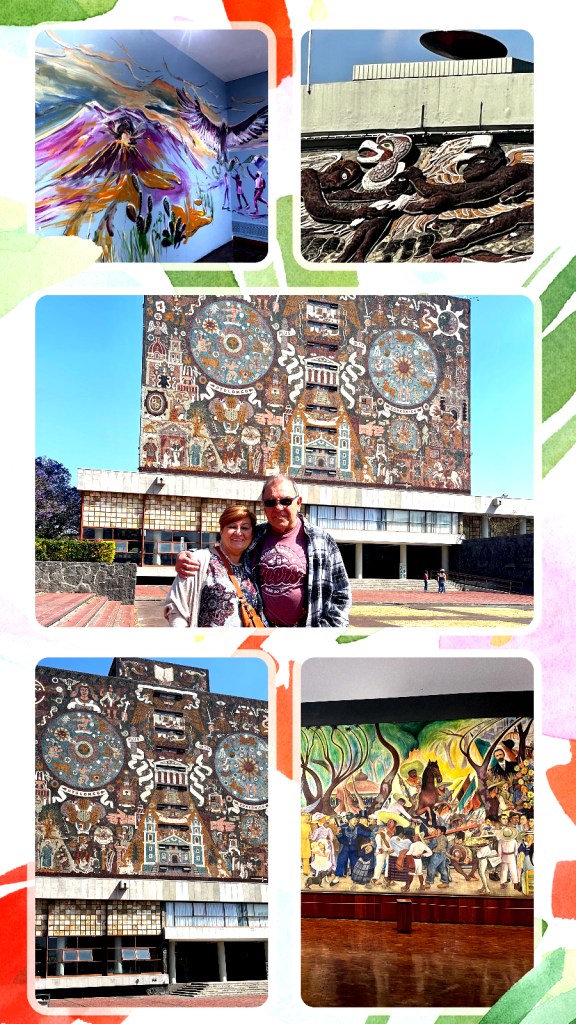 Mówiąc o muralach w Mexico City oczywiście mam na myśli piękne, wielkie  dzieła Diego Rivera i jego „kompanów artystycznych”. Oglądnęliśmy te na Kampusie uniwersyteckim oraz te, które znajdują się w “Muzeum Mural Diego Rivera”. Również stadion piłkarski zbudowany na Olimpiadę  w 1968 roku, którego ogromna część zewnętrzna udekorowana jest muralem mozaikowym.