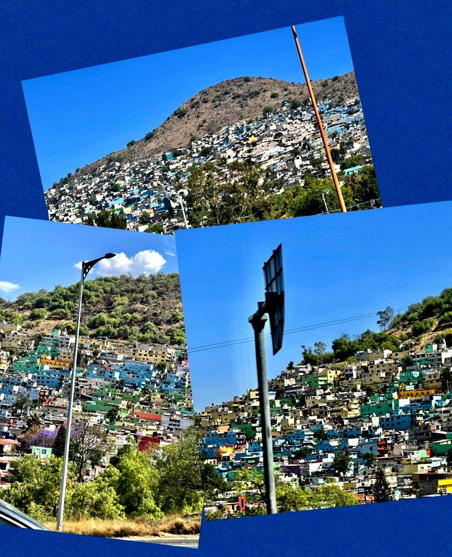 Gdy następnego dnia długo jechaliśmy do słynnej miejscowości Teotihuacan nieco poza miastem, gdzie znajduje się najsłynniejsza Piramida Słońca i kilka innych, po drodze mijaliśmy długi pas domów zwanych “Brazilian favelas”. – najbiedniejszej  dzielnicy, która żyje swoim własnym życiem i własnymi prawami. Natomiast z daleka jej zabudowa wygląda bardzo ładnie! Stanowi bajkowy obrazek wielokolorowy ślicznie pomalowanych domków, które wcale nie wyglądają na biedne i w dodatku.. niebezpieczne. Znaliśmy już ten problem z Brazylii, a pan przewodnik opowiedział nam dodatkowo o problemie społecznym tej grupy ludzi. Trudno było uwierzyć, że przy takich problemach i tak smutnym życiu ci ludzie mają siłę i ochotę na tak wesołe zewnętrzne kolorowanie swoich domów.