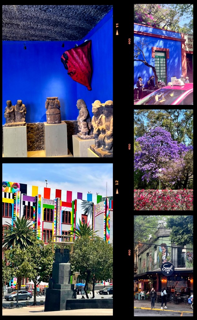 Już w pierwszym dniu przy okazji zwiedzania “Niebieskiego Domu” czyli Muzeum Frida Kahlo, kręcąc się po dzielnicy Coyoacan natychmiast zwrócił naszą  uwagę na  kolorowe domy. Każdy inny, każdy piękny! I w dodatku tonące w kwiatach i kwitnących drzewach! Podobnie jak nasz hotel. Pomalowany na biało z szafirowymi wykończeniami, a wokół dziesiątki wielkich donic z kwitnącymi pnącymi się po ścianach kwiatami. Soczysta zieleń, kolorowe światła wieczorna porą – to wszystko sprawiało magiczne wrażenie. Cudowne dzielnice takie jak Condesa, Roma – można spacerować po tych uliczkach długimi godzinami.