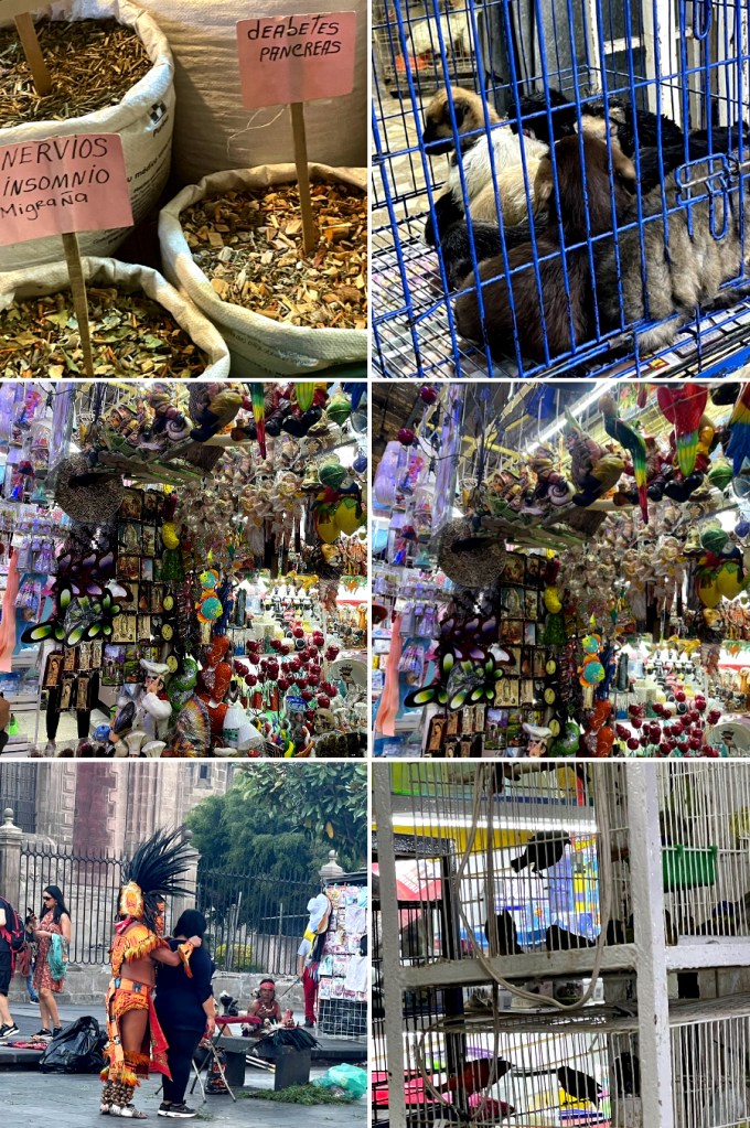Jeden z marketów, których wiele w miastach meksykańskich. “Obiegliśmy “ go dość szybko i trzymając się cały czas blisko przewodnika, który wcześniej przygotował nas czego mamy się tam spodziewać i jak go oglądać. Zatrzymywaliśmy się na krótko i tylko w niektórych miejscach. Zresztą –  nieprawdopodobna ciasnota pomiędzy stoiskami nie dawała możliwości rozglądania się i przypatrywania się temu, co jest wystawione. A było wszystko, co tylko można i nie można sobie wyobrazić!!  Głównie zszokowały mnie rzeczy związane z wierzeniami “religijnymi”, subkulturą różnych grup – figurki jakiś potworków, diabłów, zwierząt nierozpoznawalnych, koszmarnie powyginanych, pokręconych. Świece w różnych kolorach służące każda do innych rytuałów, guseł, czarów (czarne – oczywiście do tych śmiertelnych!), zapachy – niektóre okropne! najprzeróżniejsze, bardzo przerażające laleczki voodoo. “Pinaty” wielobarwne, ale służące zupełnie do innych celów niż te, które znamy tutaj w Houston i które tak bardzo lubią dzieci, kiedy są napełnione cukierkami czy czekoladkami.  Była też sekcja ziół, leków na wszelkie możliwe dolegliwości, choroby, które podobno leczą wszystko! Osoby sprzedające te zioła ponoć znają się na nich, mają przepisy jak je przygotowywać, używać tylko, że ja chyba nie miałabym odwagi do końca im zawierzyć…