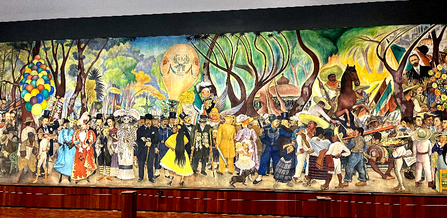 Jeden z murali D. Rivera oglądany przez nas dokładnie  i omawiany przez naszego przewodnika  przedstawia ponad 150 postaci, z tego ok. 90-ciu postaci zostało rozpoznanych i opisanych. W centralnej części muralu znajduje się sam Diego, ale  przedstawiony jest jako dziecko trzymany za rękę przez elegancko ubraną postać kobiecą, z twarzą kościotrupa. Tuż za Diego stoi Frida, dorosła. Choć wiadomo, że to ona była od niego młodsza o 20 lat. Ten mural to skarbnica postaci tamtej epoki. Księży, przeciwników i popleczników politycznych, kobiet, które dla Diego miały szczególne znaczenie. Nasz pan przewodnik opowiadał długo i ciekawie. Szkoda, że nie potrafiłam wszystkiego zapamiętać chociaż chłonęłam te opowieści z wielkim zainteresowaniem. Oczywiście, wszystko jest spisane i można dotrzeć do szczegółowych informacji. Albo po prostu – pojechać na wycieczkę do Mexico City!