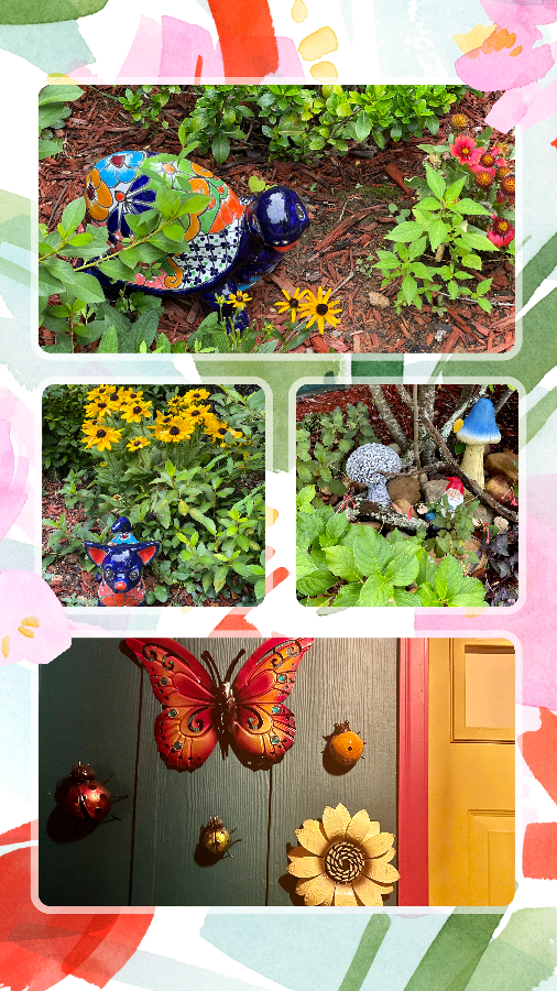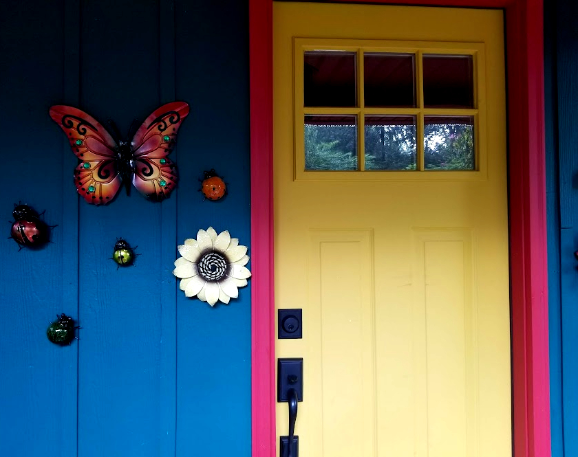 Kolory i dekoracje są pięknie wkomponowane w otaczający krajobraz, czyli różne odcienie zieleni. Wszystko razem tworzy kolorowy trójwymiarowy obraz, w którym się jest i w krórym odkrywa się ciągle coś nowego – i w którym chce się zostać, nawet jeśl tylko na krótko.. 🦋🐛🐞🦜🦔