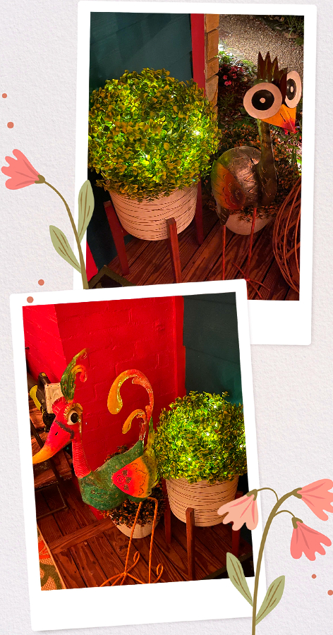 Do głównego wejścia prowadzi wąska ścieżka i wpada wprost na duże zadaszone wysokie patio. Urządzone w stylu trochę „tureckim” a może country – w centralnym miejscu stół i cztery krzesła, pięknie kolorowo pomalowane. Wiszące duże lampiony, w donicach wokół bogate rośliny podświetlone lampkami. Obok nich śmieszne art-ptaki, bardzo barwne i pstrokate, o długich szyjach. Malownicze, dodające niezwykłego uroku już na wejściu do domu.