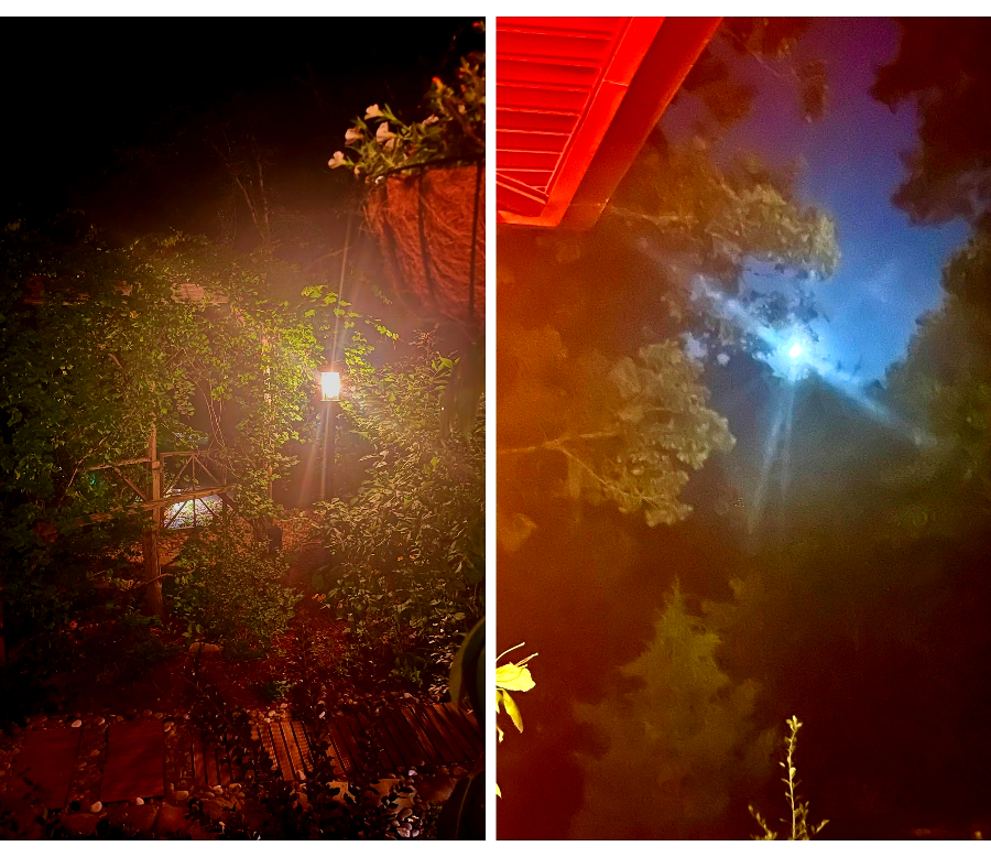 A w nocy świeci pięknie księżyc. I oczywiście nie brakuje delikatnego światła wiszących wokół ogrodowych lampionów. Na ścianie domu rozpościerają skrzydła malownicze  motyle, a pomiędzy nimi „biegają” czerwone biedronki w czarne kropeczki.