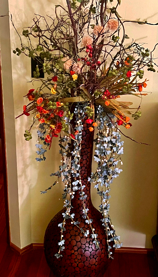 Wszystko byłoby zwyczajne jak w każdym domu, tyle że “diabeł tkwi w szczegółach”, a tych szczegółów w bajkowym domku jest bardzo wiele. Tu w łazience półeczka na kosmetyki  zręcznie wkomponowana w niewidoczne miejsce z tyłu ścianki, tam zręcznie składany stolik/półka do wygodnego wyciągania prania  z suszarki i składania rzeczy. W innym miejscu piękny ogromny wazon z niesamowitą ikebaną ułożoną ze sztucznych kwiatów i ziół. Wygląda jak obraz wtopiony w powierzchnię ściany. Dobór kolorów, układ suchych kwiatów i roślin jest ślicznie skomponowany! Widać tu rękę artysty.