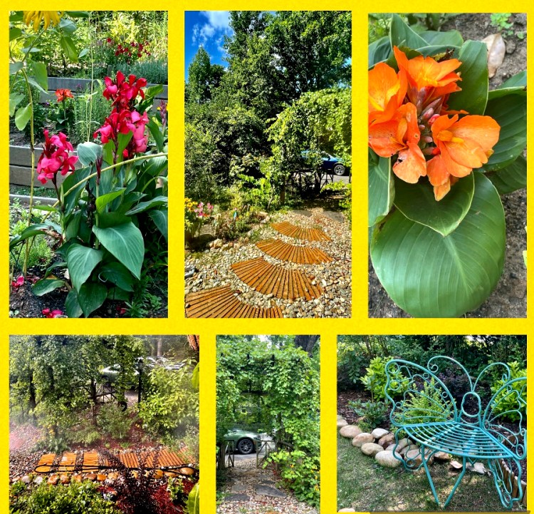 Po obu stronach ścieżki trawa i mieszanina różnokolorowych kwiatów. A pośród nich w niesamowity sposób wkomponowane są przeróżne sztuczne elementy artystyczne. Z metalu, porcelany, drewna, grubego szkła. Wiem, wiem, co niektórzy teraz sobie myślą!.. ale to jakaś niedorzeczna mieszanina, niepasująca w stylu, sztucznie połączona z naturą! Itd, itp…