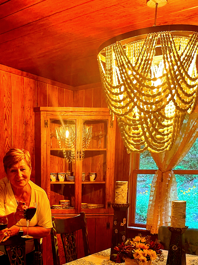 Dom wewnątrz jest nieduży, wcale nie nowoczesny. Raczej w stylu country, bardzo pasującym do otoczenia z zewnątrz. Wciąż utrzymuje się malowniczy styl, choć już nie tak bajeczny jak w ogrodzie. Na pierwszy rzut oka – dom jak każdy inny dom. Wchodzę do jadalni z kominkiem połączonej z małą, ale funkcjonalną kuchnią. W jadalni duży stół, efektowne krzesła, a nad stołem piękna zrobiona z grubych sznurów, ogromna lampa. Po lewej stronie kominek, obok wielkie stojące lampiony ze świecami, a nad kominkiem artystyczna drewniana płaskorzeźba. Coś na kształt kwiatu rozłożonego symetrycznie  na ścianie. Robi wrażenie!