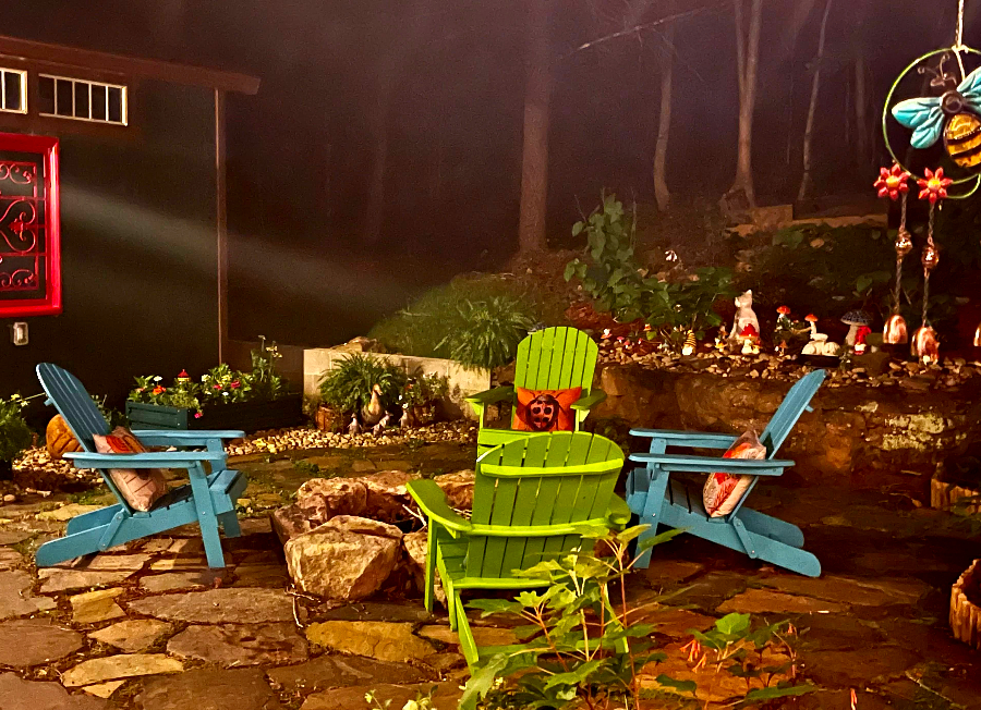 Poza zadaszeniem jest wydzielone miejsce na ognisko i wygodne drewniane kolorowe krzesła „fotelowe”.