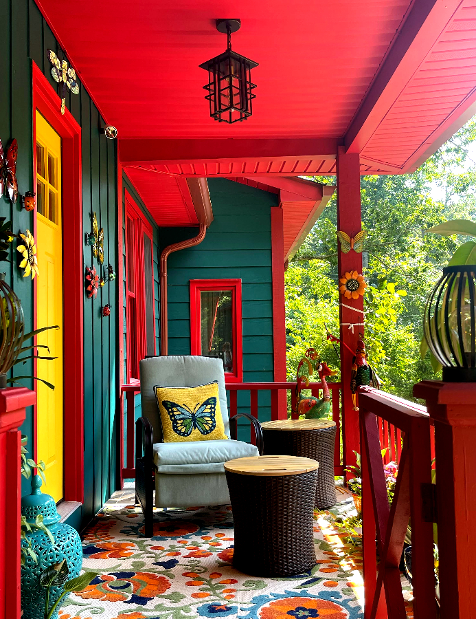 Domek ma żółte drzwi, czerwone ramy okienne i bardzo kolorowe kwieciste dywany na gankach.