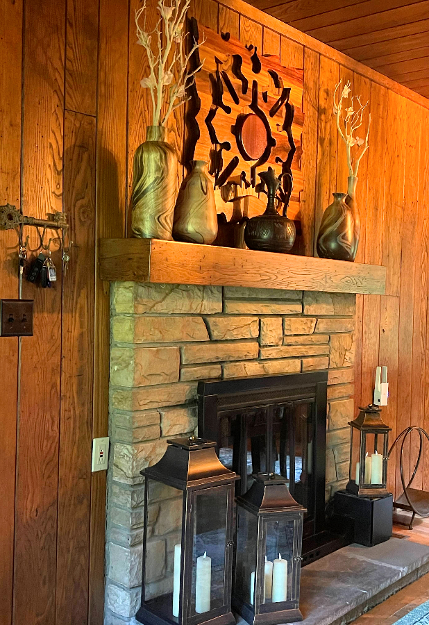 Kominek z lampionami i piękną drewnianą płaskorzeźbą