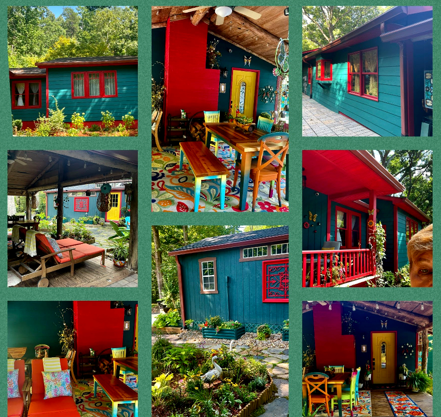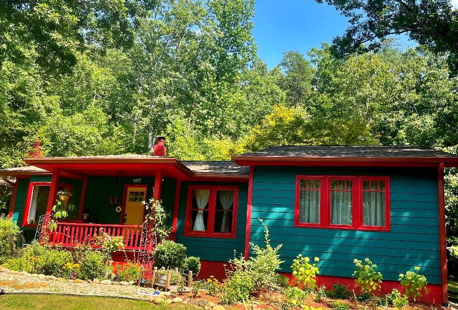 Ktoś, kto tchnął nowe życie w ten skrawek ziemi, kocha kolory. Mocne, soczyste kolory! W samym środku stoi domek, nieduży, ale bardzo przytulny. Kto z was miałby odwagę zamieszkać w domu o kolorze ostrej ceglastej pomarańczy i ciemnej butelkowe zieleni??  Ja – tak!  Ale jestem pewna, że wiele osób długo by się zastanawiało nad taką decyzją..