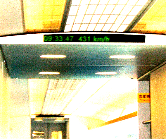 Trzy lata później podróżując po Chinach, doznałam podobnych emocji, kiedy już tuż przed powrotem do Stanów, przemieszczaliśmy się pociągiem w Szanghaju, z miasta na lotnisko. Pociąg nie miał kierowcy – Człowieka, pędził jak szalony, trudno było patrzeć się w boczne okno.. Obraz uciekał jak na mocno przyspieszonym filmie. Linia Maglev łączy stację w centrum miasta ze stacją Pudong International Airport. Szybkość jazdy pociągu.. – sami zobaczcie na zachowanym, ale autentycznym zdjęciu z 2006 roku.
