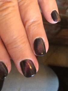 Manicure zrobiony kiedyś w Sosnowcu- bardzo mi się podobał. Nazywał się „kocie oko” Za pomocą magnesu przyciąga się opiłki kolorowych metali, które stwarzają efekt świetlistego koloru.